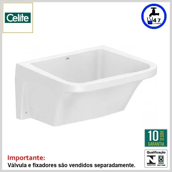 Produto confeccionado em material cerâmico esmaltado, sendo indicado para utilização em lavanderias e áreas de serviço. O produto pode ser instalado com coluna de apoio Celite ref.51203 (fixada no piso) ou sem coluna, desde que sobre parede de alvenaria e com o uso de conjunto de fixação apropriado, adquiridos em separado.