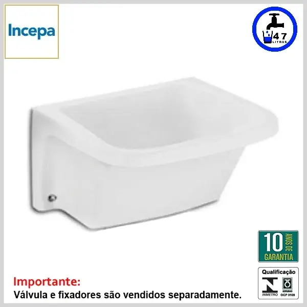 Produto confeccionado em material cerâmico esmaltado, sendo indicado para utilização em lavanderias e áreas de serviço. O produto pode ser instalado com coluna de apoio Incepa ref.51203 (fixada no piso) ou sem coluna, desde que sobre parede de alvenaria e com o uso de conjunto de fixação apropriado, adquiridos em separado.