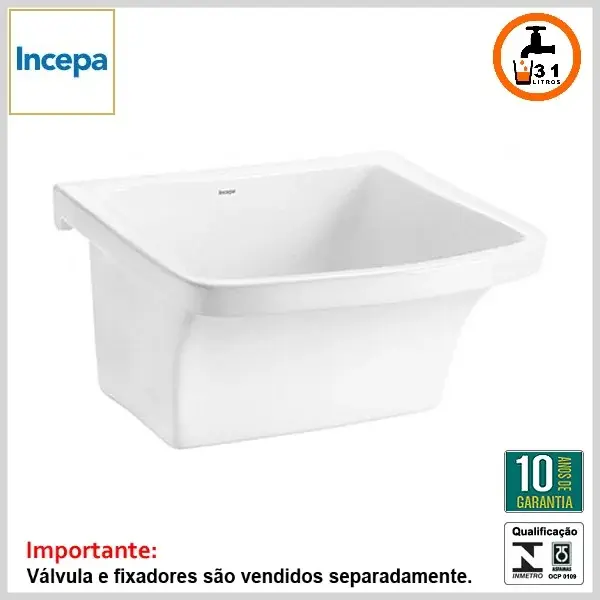 Produto confeccionado em material cerâmico esmaltado, sendo indicado para utilização em lavanderias e áreas de serviço. O produto pode ser instalado com coluna de apoio Incepa ref.51203 (fixada no piso) ou sem coluna, desde que sobre parede de alvenaria e com o uso de conjunto de fixação apropriado, adquiridos em separado.