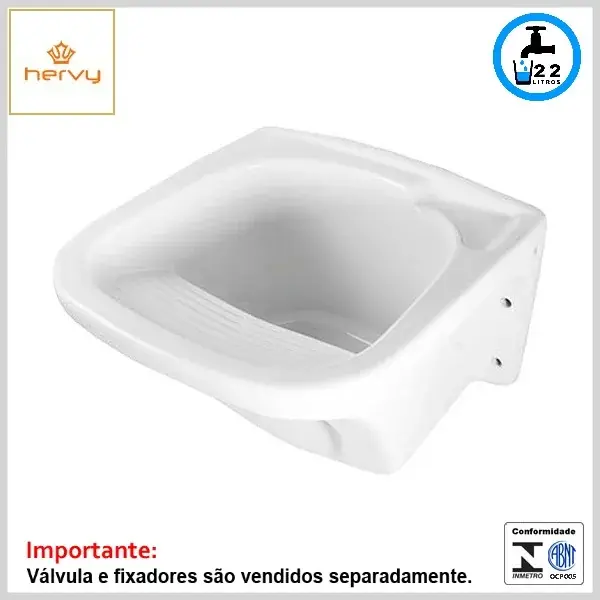 Produto confeccionado em material cerâmico esmaltado, sendo indicado para utilização em lavanderias e áreas de serviço. O produto pode ser instalado com coluna de apoio Hervy ref.308 (fixada no piso) ou sem coluna, desde que sobre parede de alvenaria e com o uso do conjunto de fixação apropriado, adquiridos em separado.