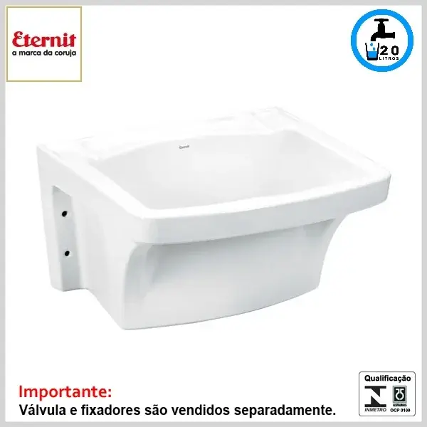 Produto confeccionado em material cerâmico esmaltado, sendo indicado para utilização em lavanderias e áreas de serviço. O produto pode ser instalado com coluna de apoio Eternit (fixada no piso) ou sem coluna, desde que sobre parede de alvenaria e com o uso do conjunto de fixação apropriado, adquiridos em separado.