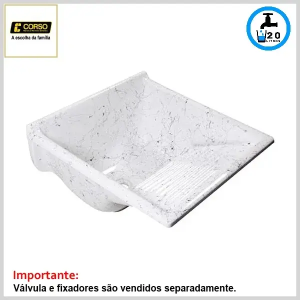 Produto confeccionado em mármore sintético granitado brilhante, sendo indicado para utilização em lavanderias e áreas de serviço. O produto pode ser instalado com coluna de apoio Corso (fixada no piso) ou sem coluna, desde que sobre parede de alvenaria e com o uso do conjunto de fixação apropriado, adquiridos em separado.