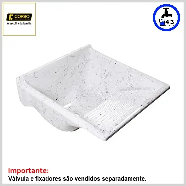 Produto confeccionado em mármore sintético granitado brilhante, sendo indicado para utilização em lavanderias e áreas de serviço. O produto pode ser instalado com coluna de apoio Corso (fixada no piso) ou sem coluna, desde que sobre parede de alvenaria e com o uso do conjunto de fixação apropriado, adquiridos em separado.