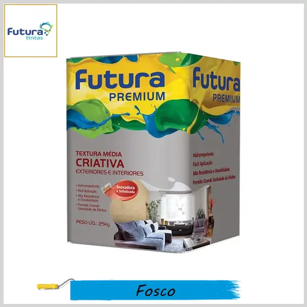A Textura Acrílica Média Criativa Futura Premium possui como característica um acabamento mais inovador, permitindo disfarçar pequenas imperfeições em superfícies internas e externas de alvenaria, massa corrida, massa acrílica, gesso e ficrocimento. Contém partículas médias de minerais especiais de aspecto final mais sofisticado, além de um exclusivo componente hidrorrepelente que protege as superfícies e impede a penetração de água, aumentando a sua resistência ao intemperismo. Na cor branca e acabamento fosco, está também disponível em diversas cores prontas e no Sistema Magia das Cores com mais de 2000 tonalidades.