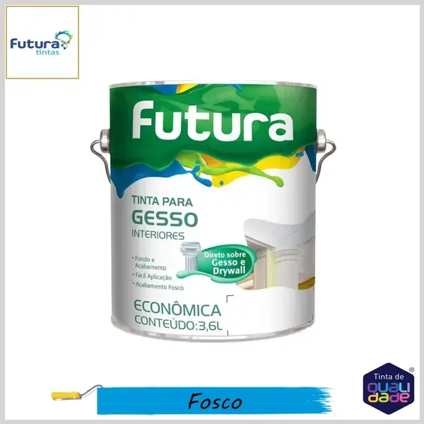 A Tinta Acrílica para Gesso Futura é uma tinta branca de qualidade econômica, indicada para pintura direta sobre superfícies de gesso, placas de gesso ou acartonados (drywall). Sua fórmula especial age como fixadora de partículas soltas sobre gesso, proporcionando um melhor acabamento sem a necessidade de utilização de fundos preparadores. Possui ótimo poder de cobertura, secagem rápida, alastramento e rendimento, com acabamento fosco, além de oferecer boa resistência às intempéries.