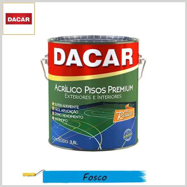 Dacar Acrílico Pisos Premium é uma tinta acrílica de acabamento fosco, superaderente e de fácil aplicação para interiores e exteriores. Oferece grande resistência aos rigores do sol e da chuva e à abrasão, além de ótimo rendimento, excelente cobertura e acabamento. É indicada para aplicação sobre superfícies de pisos cimentados em quadras poliesportivas, varandas, calçadas, escadarias, áreas de lazer, demarcações de garagens, estacionamentos, pisos comerciais e outras áreas de concreto rústico, sujeitas ao tráfego de pessoas e veículos.