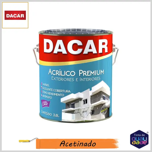 Dacar Acrílico Premium é uma tinta acrílica para interiores e exteriores de baixo odor e alta durabilidade, que apresenta finíssimo acabamento com altíssima resistência às intempéries, alcalinidade e ao mofo. Por possuir consistência mais viscosa, oferece fácil aplicação com baixo índice de respingos, garantindo um excelente rendimento, menos sujeira, boa cobertura e secagem rápida. Nas versões acetinado, fosco e semibrilho, é indicada para paredes externas e internas de alvenaria, sobre massa corrida ou acrílica, reboco, concreto, fibrocimento, gesso, texturas e repintura sobre tinta látex.
