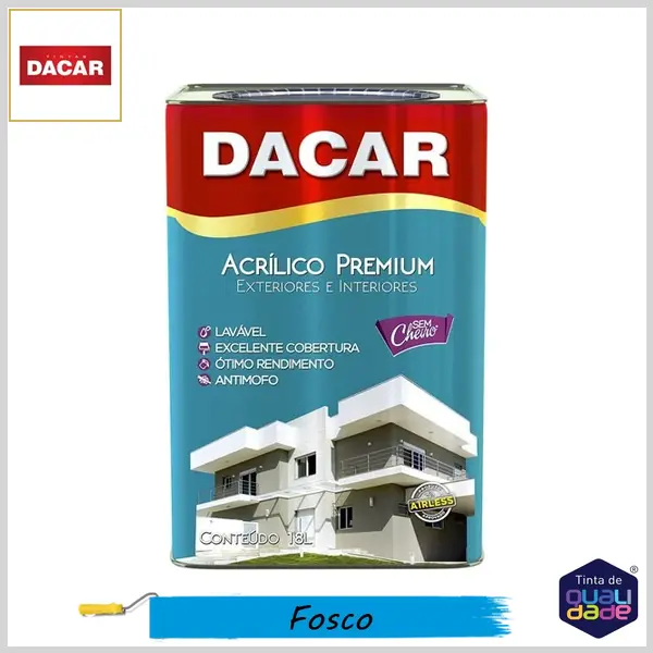 Dacar Acrílico Premium é uma tinta acrílica para interiores e exteriores de baixo odor e alta durabilidade, que apresenta finíssimo acabamento com altíssima resistência às intempéries, alcalinidade e ao mofo. Por possuir consistência mais viscosa, oferece fácil aplicação com baixo índice de respingos, garantindo um excelente rendimento, menos sujeira, boa cobertura e secagem rápida. Nas versões acetinado, fosco e semibrilho, é indicada para paredes externas e internas de alvenaria, sobre massa corrida ou acrílica, reboco, concreto, fibrocimento, gesso, texturas e repintura sobre tinta látex.