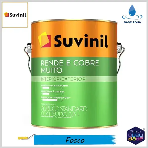 Suvinil Rende e Cobre Muito é uma tinta acrílica standard fosca de ótima cobertura, com baixo odor e excelente rendimento e alastramento, além de possuir uma ótima consistência que facilita a aplicação do produto após a sua diluição. É indicada para a pintura de superfícies em ambientes internos e externos de reboco, massa acrílica, massa corrida, texturas, concreto, fibrocimento e gesso. Obtenha mais informações sobre o produto consultando o Boletim Técnico anexado à esta página.