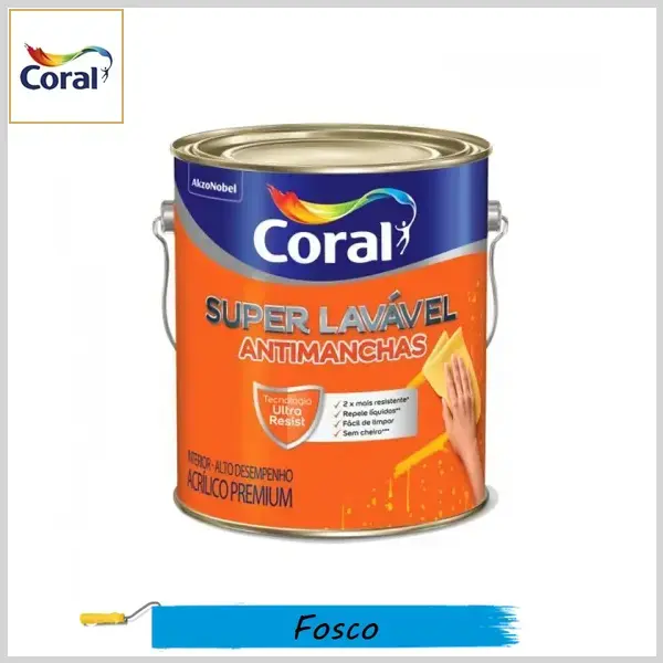 CORAL SUPER LAVÁVEL é uma tinta acrílica de alto desempenho, indicada para ambientes internos. Com sua inovadora tecnologia UltraResist, torna-se duas vezes mais resistente à limpeza em relação às tintas premium foscas, repelindo líquidos e facilitando a limpeza de manchas de chocolate, ketchup, café, refrigerantes, sucos, lápis, canetas esferográficas e batom. Não tem cheiro e seu acabamento EggShell tem um nível de brilho muito próximo ao acabamento fosco, o que ajuda a disfarçar as imperfeições da parede. Uma lata de 18lt pinta até 324m² por demão.