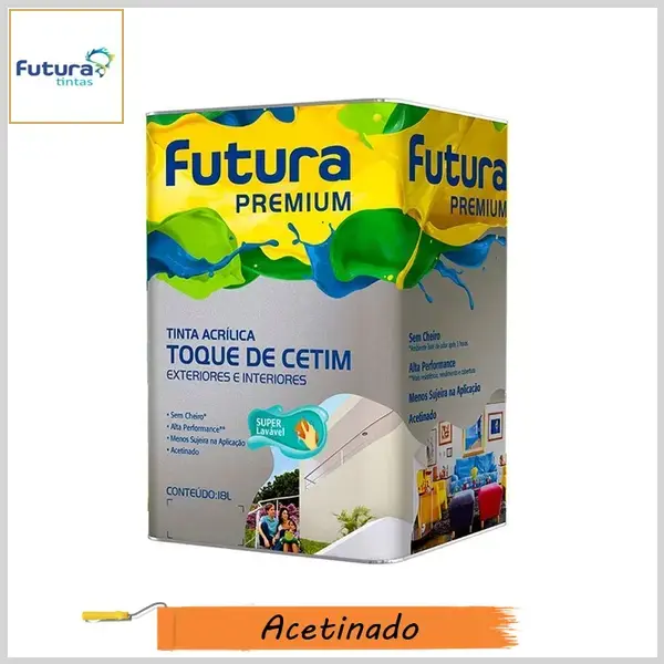 A Tinta Acrílica Toque de Cetim Futura Premium é um produto com mínimo odor e sem cheiro após 3 horas da sua aplicação. Com boa resistência às intempéries, é indicada para pintura de superfícies internas e externas de alvenaria, massa corrida, massa acrílica, texturas, gesso e fibrocimento. Possui excelente poder de cobertura, alastramento e rendimento, com acabamento de brilho suave acetinado, em cores prontas ou, em mais de 2000 tonalidades pelo Sistema Tintométrico Magia das Cores.
