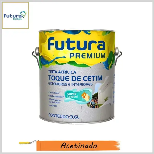 A Tinta Acrílica Toque de Cetim Futura Premium é um produto com mínimo odor e sem cheiro após 3 horas da sua aplicação. Com boa resistência às intempéries, é indicada para pintura de superfícies internas e externas de alvenaria, massa corrida, massa acrílica, texturas, gesso e fibrocimento. Possui excelente poder de cobertura, alastramento e rendimento, com acabamento de brilho suave acetinado, em cores prontas ou, em mais de 2000 tonalidades pelo Sistema Tintométrico Magia das Cores.