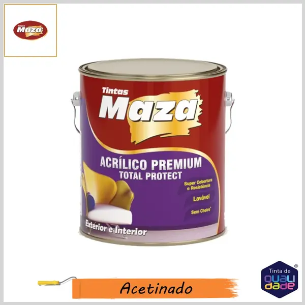 Maza Acrílico Total Protect é uma tinta acrílica de categoria Premium lavável e sem cheiro, de alto desempenho e durabilidade, com excelente rendimento e grande resistência à intempéries. Com acabamentos acetinado, fosco e semibrilho, é indicada para pintura de superfícies internas e externas de reboco, massa acrílica ou corrida, texturas, concreto, fibrocimento, gesso entre outras.