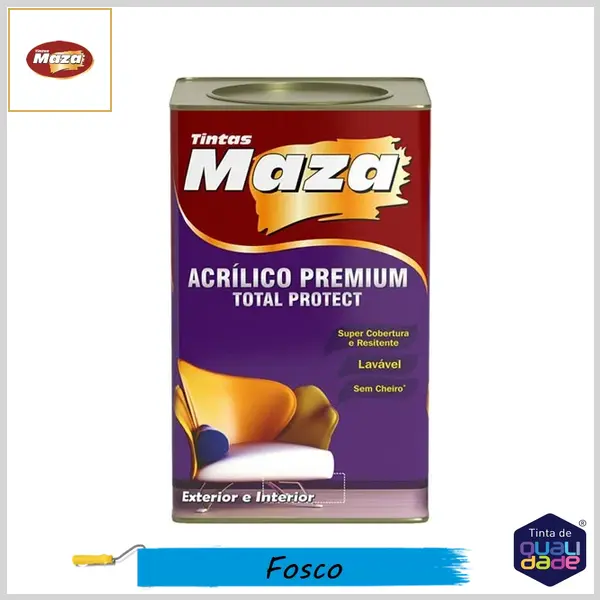 Maza Acrílico Total Protect é uma tinta acrílica de categoria Premium lavável e sem cheiro, de alto desempenho e durabilidade, com excelente rendimento e grande resistência à intempéries. Com acabamentos acetinado, fosco e semibrilho, é indicada para pintura de superfícies internas e externas de reboco, massa acrílica ou corrida, texturas, concreto, fibrocimento, gesso entre outras.