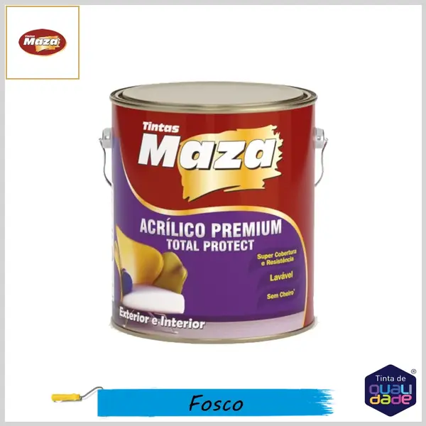 Maza Acrílico Total Protect é uma tinta acrílica de categoria Premium lavável e sem cheiro, de alto desempenho e durabilidade, com excelente rendimento e grande resistência à intempéries. Com acabamentos acetinado, fosco e semibrilho, é indicada para pintura de superfícies internas e externas de reboco, massa acrílica ou corrida, texturas, concreto, fibrocimento, gesso entre outras.