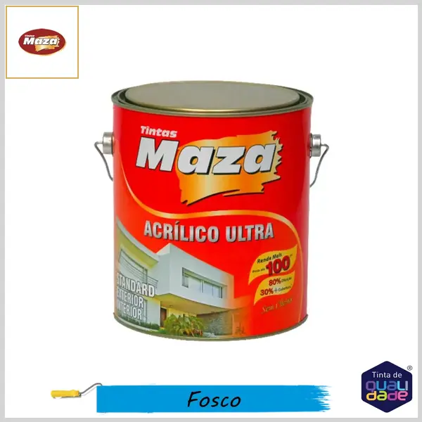 Maza Acrílico Ultra é uma tinta acrílica fosca de categoria Standard, superconcentrada e de alto rendimento, permitindo diluição com água entre 50 e 80%. Não apresenta cheiro e possibilita um acabamento perfeito, rápida secagem, mínimo respingamento, durabilidade e resistência à intempéries. É indicada para pintura de superfícies internas e externas de reboco, massa acrílica ou corrida, texturas, concreto, fibrocimento, entre outras.
