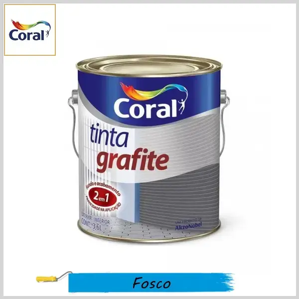 CORAL TINTA GRAFITE é uma tinta sintética fosca que apresenta dupla ação: fundo e acabamento. É indicada para aplicação em superfícies internas e externas de metais ferrosos. Sua fórmula apresenta excelente proteção, resistência e durabilidade aos metais. Um galão de 3.6L rende até 40m² de cobertura.