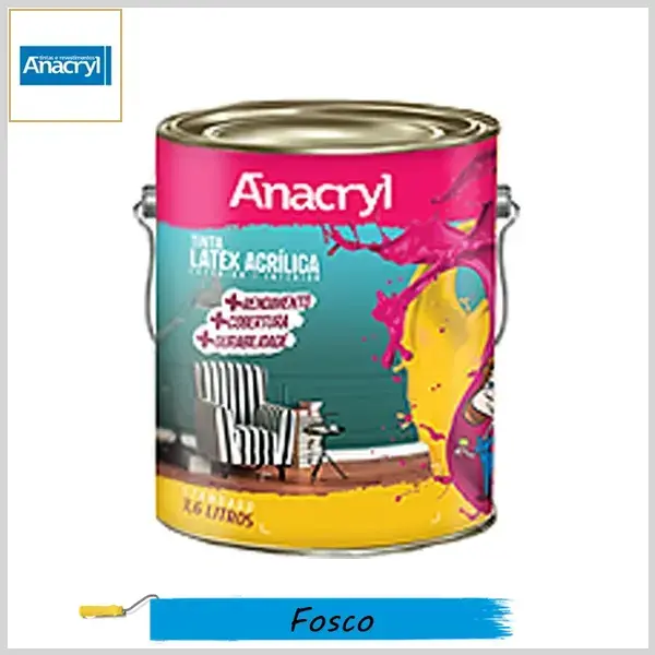 O Látex Acrílico Anacryl é uma tinta de qualidade standard com acabamento fosco, indicada para pintura ou repintura de superfícies internas e externas. Pode ser aplicada em alvenarias, massas corridas e acrílicas, texturas e gesso, possuindo um alto poder de cobertura, ótimo rendimento e resistência às intempéries.
