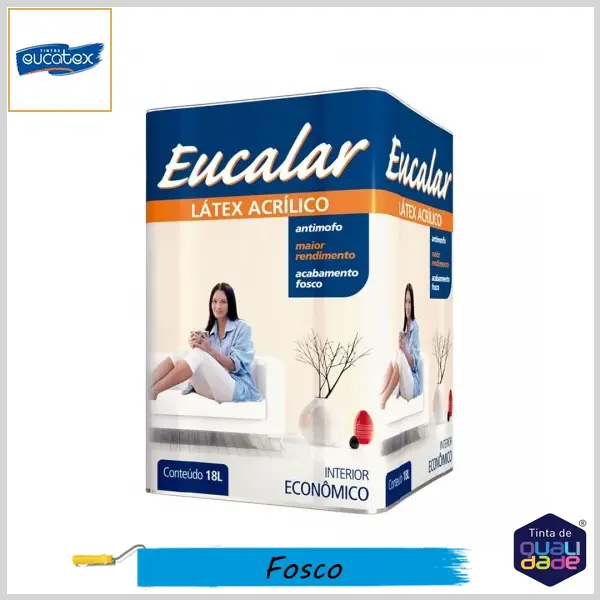 Eucatex Eucalar Látex Acrílico é uma tinta com acabamento fosco, indicada para a pintura de superfícies internas de reboco, concreto, madeira, fibrocimento, massa acrílica, textura acrílica, forros acústicos e superfícies internas de massa corrida e gesso.