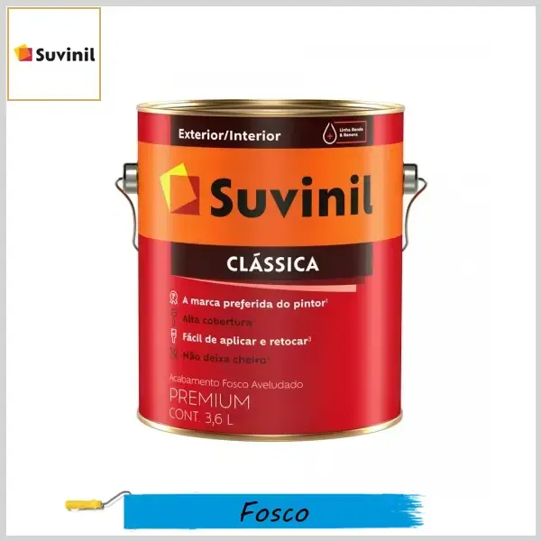 SUVINIL CLÁSSICA é uma tinta especialmente desenvolvida com uma fórmula que garante 2 vezes mais resistência e 40% mais rendimento, além de ser sem cheiro e oferecer facilidade na aplicação.