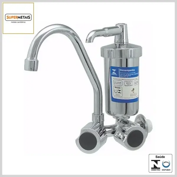 Produto com corpo em metal cromado, volante e filtro em plástico Abs cromado, sendo indicado para uso em pias de cozinhas, churrasqueiras e similares. Possui entrada em 1/2" ou 3/4" com o uso de adaptador, fornecido junto com o produto.
