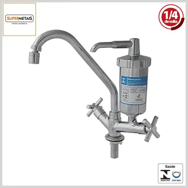 Produto com corpo e volante em metal cromado e filtro em plástico Abs cromado, sendo indicado para uso em pias de cozinhas, churrasqueiras e similares. Possui entrada em 1/2" e sistema de vedação 1/4Volta Mvc cerâmico.