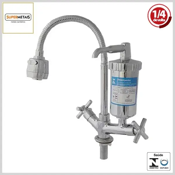 Produto com corpo e volante em metal cromado e filtro em plástico Abs cromado, sendo indicado para uso em pias de cozinhas, churrasqueiras e similares. Possui entrada em 1/2" e sistema de vedação 1/4Volta Mvc cerâmico.