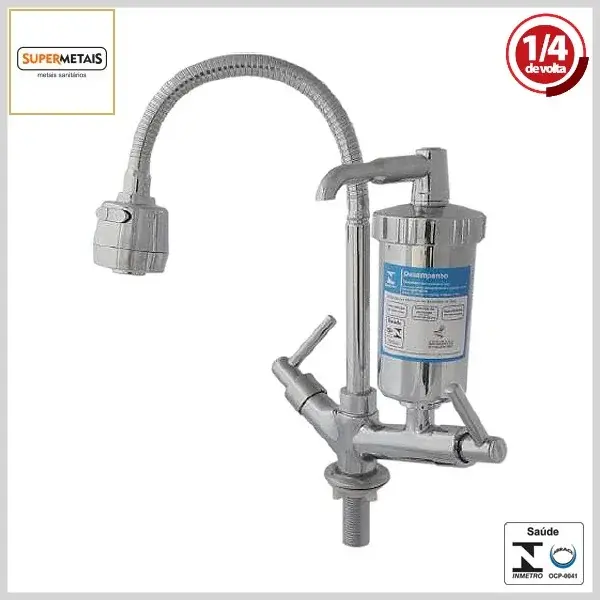 Produto com corpo e volante em metal cromado e filtro em plástico Abs cromado, sendo indicado para uso em pias de cozinhas, churrasqueiras e similares. Possui entrada em 1/2" e sistema de vedação 1/4Volta Mvc cerâmico.