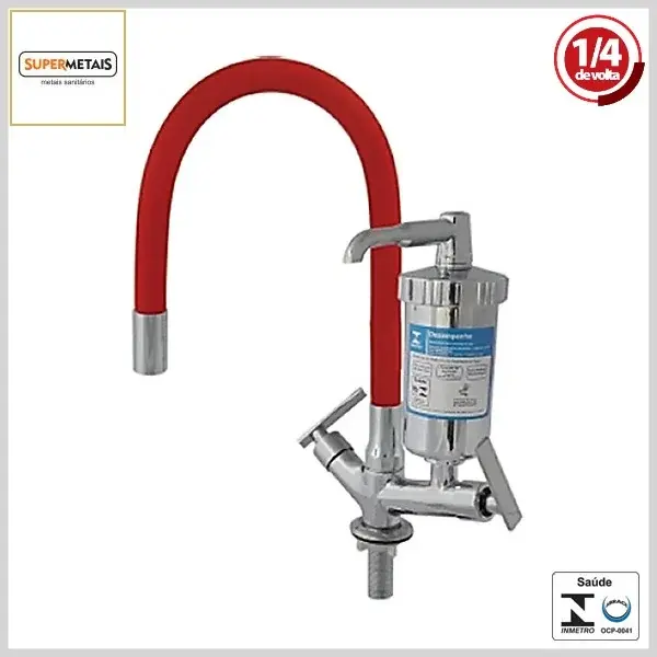 Produto com corpo e volante em metal cromado, bica colorida e filtro em plástico Abs cromado, sendo indicado para uso em pias de cozinhas, churrasqueiras e similares. Possui entrada em 1/2" e sistema de vedação 1/4Volta Mvc cerâmico.